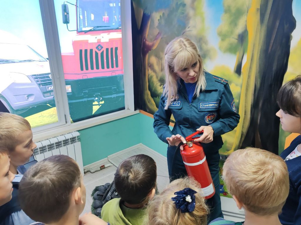 Наталья Владимировна рассказала об устройстве огнетушителя и его предназначении. Показала, как им пользоваться.