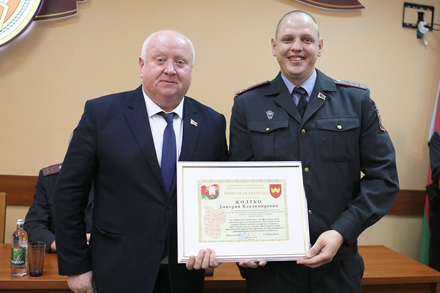 Почетной грамотой райисполкома за добросовестный труд, профессионализм, высокую результативность деятельности по охране общественного порядка и борьбе с преступностью отмечен инспектор уголовно-исполнительной инспекции милиции общественной безопасности Воложинского РОВД, капитан милиции Дмитрий Жолтко.