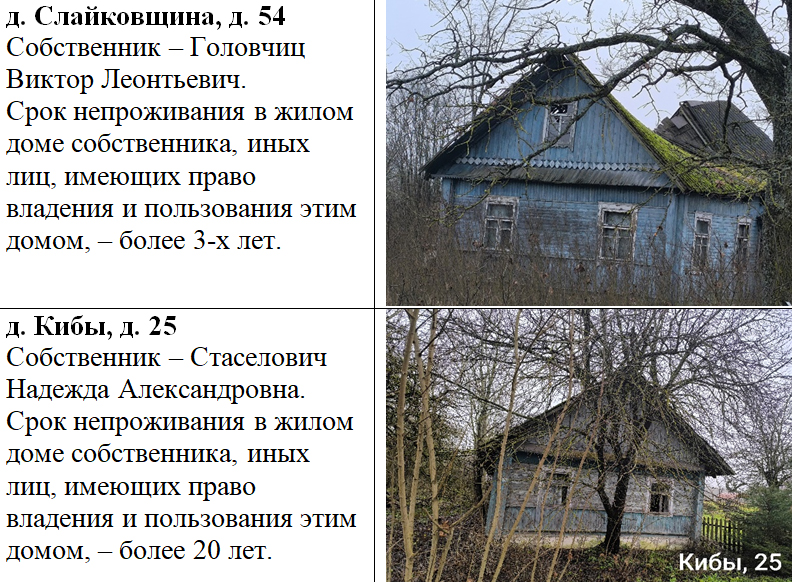 В целях реализации Указа Президента Республики Беларусь от 24 марта 2021 г. № 116 «Об отчуждении жилых домов в сельской местности и совершенствовании работы с пустующими домами» разыскиваются собственники, наследники и лица, имеющие право пользования жилыми домами: