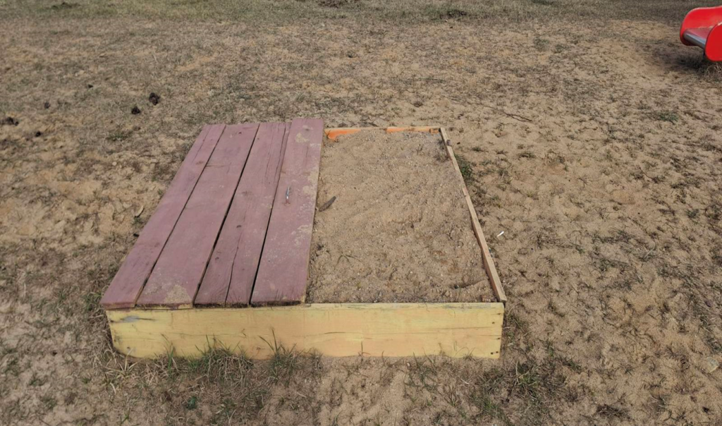 Песочница требует оборудования, так как у нее сломана крышка. Кроме того, деревянный пляжный зонт находится в технически неисправном состоянии и не укреплен, а все малые архитектурные формы нуждаются в покраске.