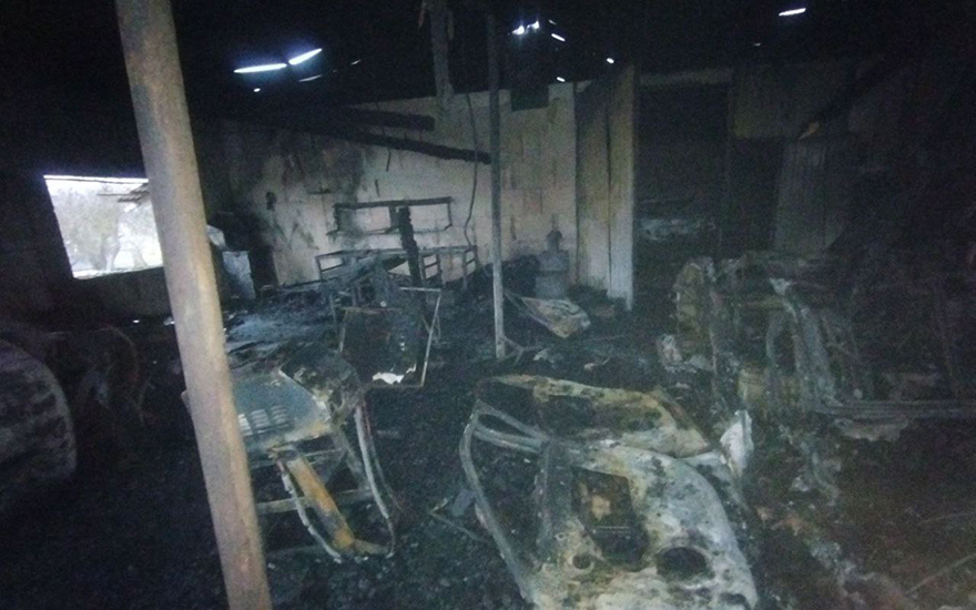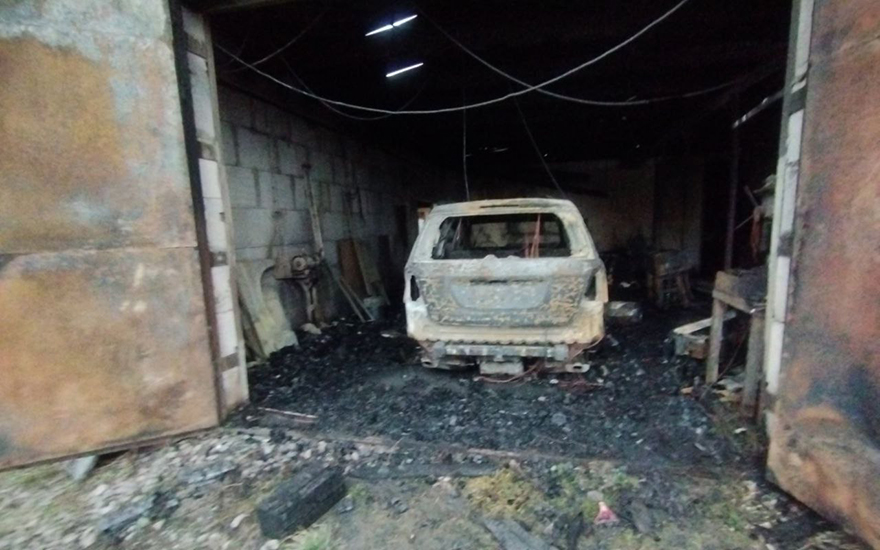 Огнем частично повреждена кровля. Уничтожено все имущество внутри. Сгорели 3 легковых автомобиля: Toyota Corolla (2000 г.в.), Mercedes GL (2012 г.в.) и Range Rover (2020 г.в.).