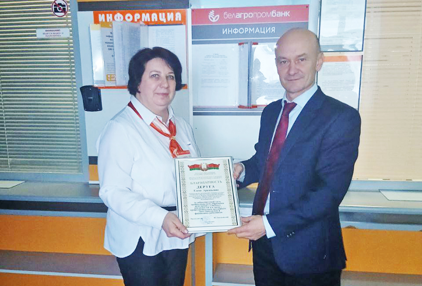 Специалисту по обслуживанию частных клиентов I категории отдела розничных продаж Центра банковских услуг № 514 ОАО «Белагропромбанк» Елене Деруга объявлена Благодарность председателя Воложинского райисполкома.
