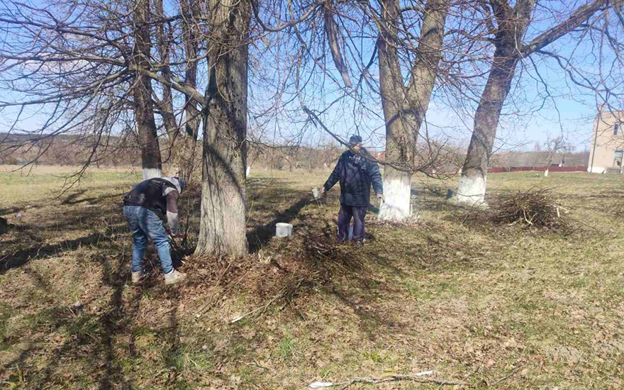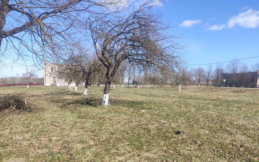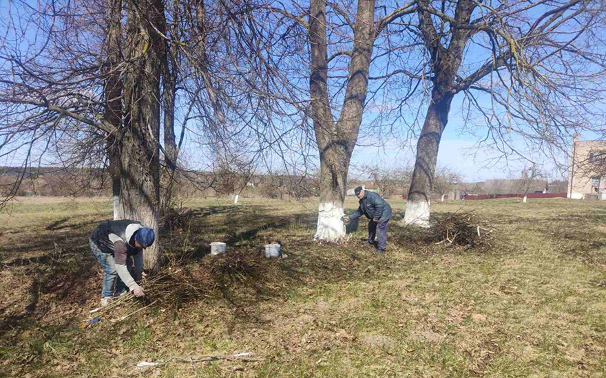 - Побелка фруктового сада — теперь деревья не только радуют глаз, но и защищены от вредителей.