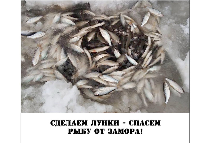 Первые признаки зимних заморов рыбы – это появление в лунках и прорубях молоди рыбы, других организмов. Вода в этот период становится мутной и приобретает неприятный запах. Рыболовы- любители, которые в этот период бывают на водоемах, могут помочь гибнущей рыбе: несколько вырубленных лунок – это дополнительное количество кислорода в воде.