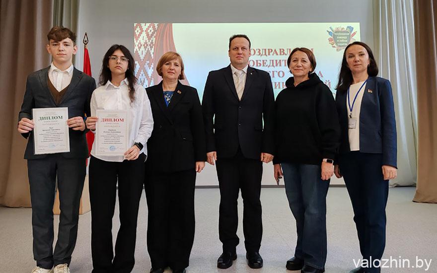 И вот наконец со сцены были названы имена участников олимпиады, которые оказались сильнее других в интеллектуальных соревнованиях. Среди победителей и учащиеся Воложинского района. Это представители гимназии: десятиклассник Арсений Трус, занявший второе место и обладательница диплома первой степени девятиклассница Ксения Бартош.