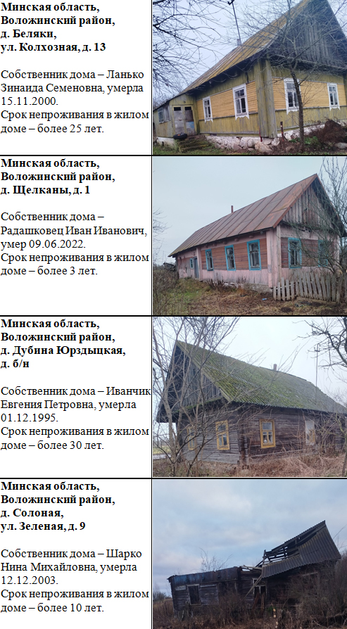 Воложинский сельский исполнительный комитет в целях реализации Указа Президента Республики Беларусь от 24 марта 2021 г. № 116 «Об отчуждении жилых домов в сельской местности и совершенствовании работы с пустующими домами» разыскивает собственников, наследников и лиц, имеющих право пользования жилыми домами.