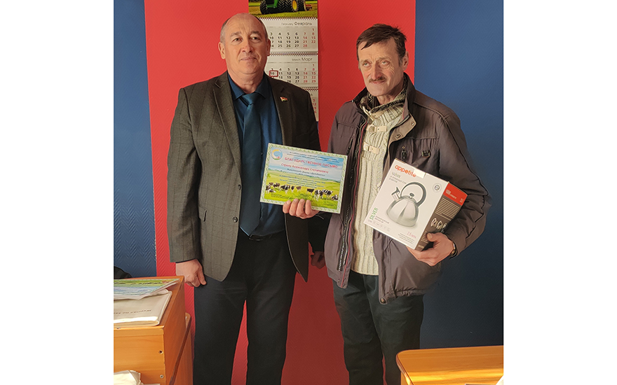 Они поблагодарили животноводов за работу и вручили благодарственные письма и ценные подарки от Воложинского районного комитета профсоюза работников АПК «За добросовестный труд, высокий профессионализм, образцовое выполнение служебных обязанностей и достижение высоких показателей в работе»: