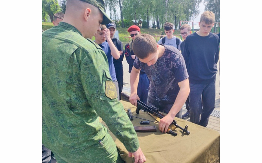 Совместно с ними учащиеся с интересом принимают участие в республиканских акциях «Служим Беларуси!», «К защите Отечества готов!». Доброй традицией и любимым мероприятием старшеклассников стало посещение торжественного воинского ритуала принятия военной присяги в войсковой части 30695, а для младших школьников — экскурсии в комнату боевой славы. При посещении части ребята знакомятся, как проходит военная служба солдат, как выглядит строевой плац, как устроен быт военнослужащих, чем они занимаются в свободное время. Старшеклассники выполняют неполную разборку и сборку АК-74, а также проходят учебно-полевые сборы в рамках программы учебного предмета «Допризывная подготовка».