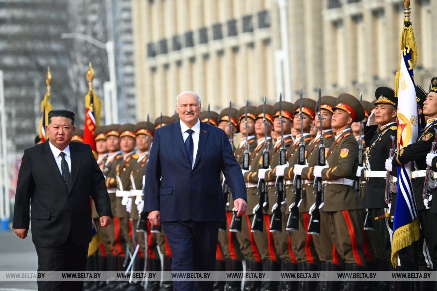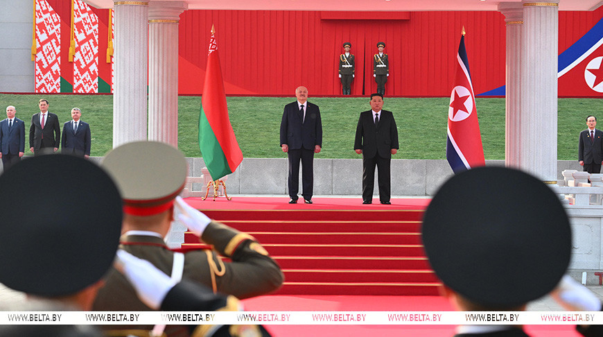 Церемония официальной встречи Президента Беларуси Александра Лукашенко Председателем Государственных дел Корейской Народно-Демократической Республики Ким Чен Ыном прошла в Пхеньяне, передает БЕЛТА.
