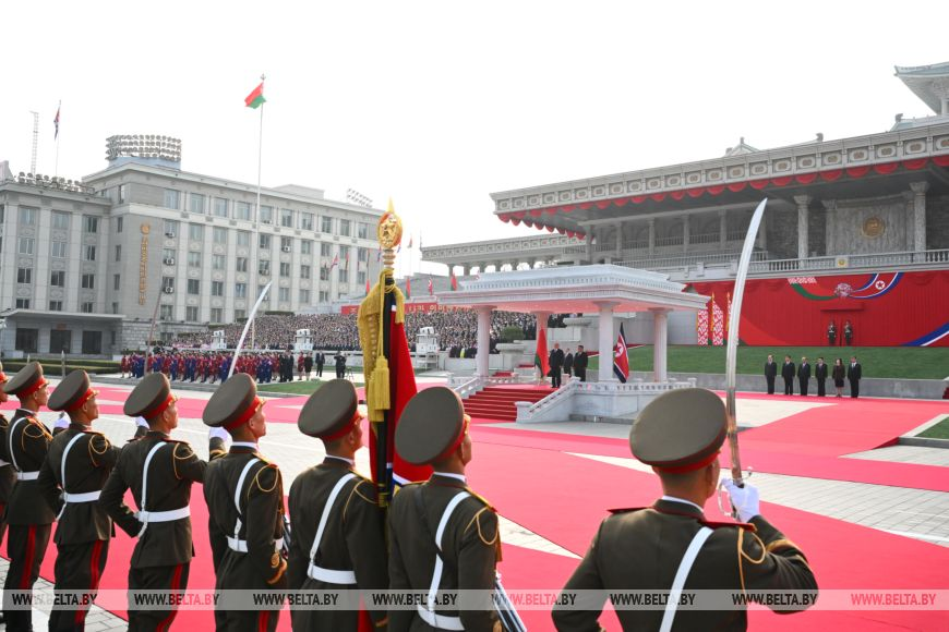 Глава государства почтил память советских воинов, погибших при освобождении Кореи от японских захватчиков, была объявлена минута молчания. Здесь также были исполнены гимны Беларуси и КНДР.