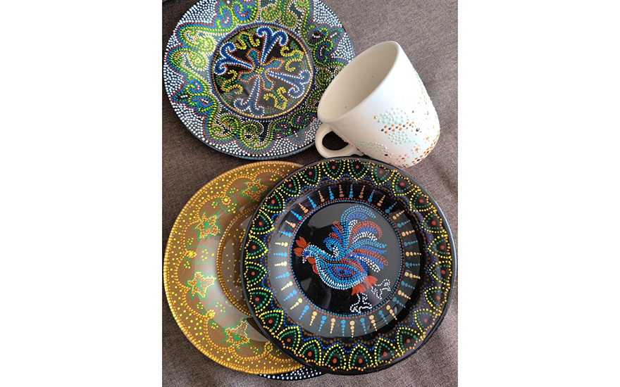Ее творческая энергия неиссякаема. Вот, например, декоративные тарелки в технике точечной мозаики. Они не просто украшают интерьер, но и полностью функциональны: их можно использовать для сервировки, и даже ставить в микроволновку. Мастерица наносит узоры акриловыми красками и покрывает лаком только с обратной стороны, оставляя лицевую поверхность безопасной. Таким образом, обычная прозрачная тарелка превращается в уникальное произведение искусства с узорами от изящных орнаментов до изображений животных.