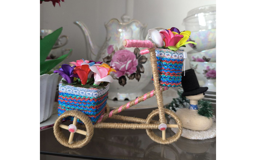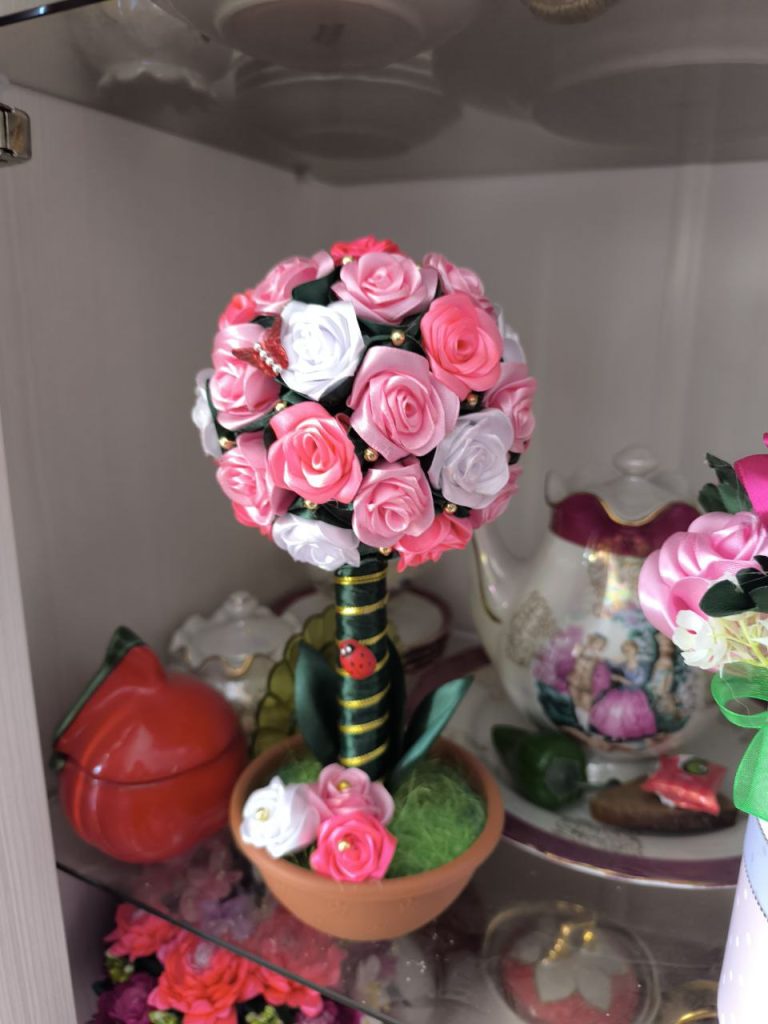 Гиацинты в горшочках, не отличимые от живых, декоративный велосипед из бечевки, вышитые картины на стенах, хранящие целые истории, десятки милых поделок, дерево счастья из лент, декоративные букеты в коробках и даже яйца в стиле Фаберже – от всего увиденного на душе становится тепло и светло.