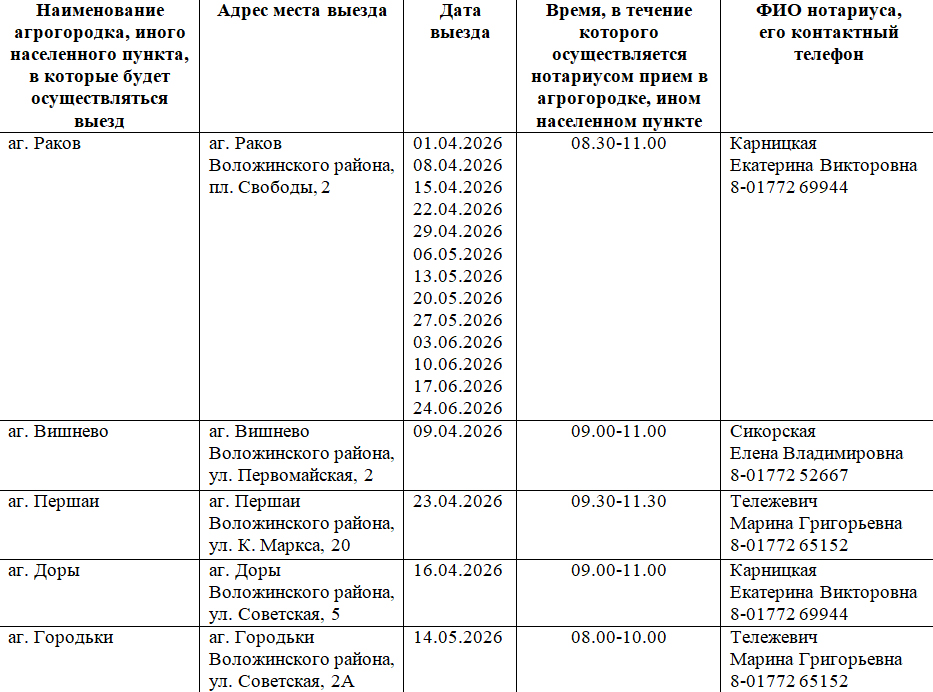 Выезды нотариусов состоятся в соответствии с графиком при наличии заявок, поступивших в нотариальную контору, за которой закреплен конкретный агрогородок (иной населенный пункт), не позднее рабочего дня (в соответствии с утвержденным режимом работы нотариальной конторы, нотариального бюро), предшествующего дате выезда, предусмотренной графиком выезда.