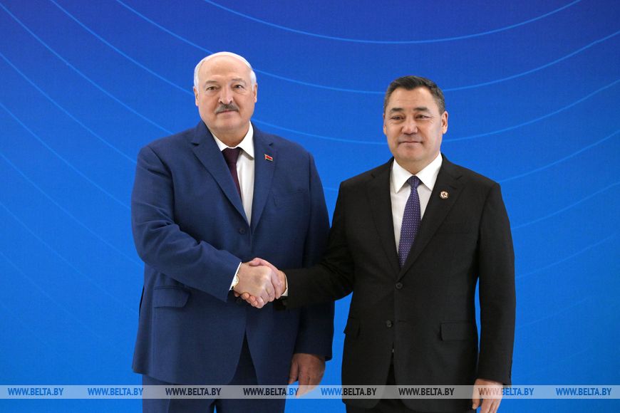 Глава белорусского государства прибыл к месту проведения саммита в административном здании «Ынтымак ордо», где его приветствовал Президент Кыргызстана Садыр Жапаров.