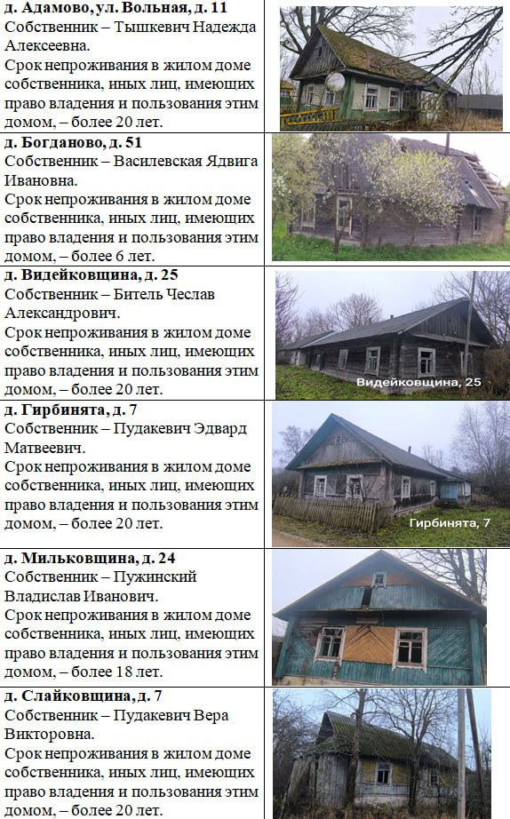 В целях реализации Указа Президента Республики Беларусь от 24 марта 2021 г. № 116 «Об отчуждении жилых домов в сельской местности и совершенствовании работы с пустующими домами» разыскиваются собственники, наследники и лица, имеющие право пользования жилыми домами.