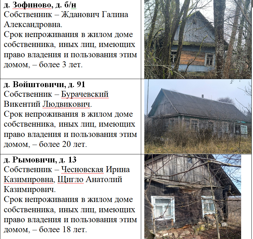 В целях реализации Указа Президента Республики Беларусь от 24 марта 2021 г. № 116 «Об отчуждении жилых домов в сельской местности и совершенствовании работы с пустующими домами» разыскиваются собственники, наследники и лица, имеющие право пользования жилыми домами.