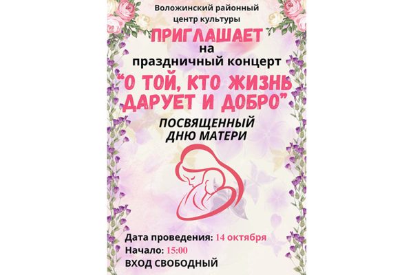 Дорогие друзья! Воложинский районный центр культуры приглашает вас на трогательный и прекрасный праздничный концерт: «О ТОЙ, КТО ЖИЗНЬ ДАРУЕТ И ДОБРО», посвящённый самому тёплому празднику — Дню Матери. Ждём вас: 14 октября в 15:00 Воложинский районный центр культуры ВХОД СВОБОДНЫЙ! Подарите себе и своим любимым мамам несколько часов прекрасной музыки и тёплых поздравлений!